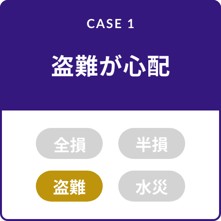 CASE1 盗難が心配 CASE2 しっかり補償 CASE3 車両破損も盗難も安心 CASE4 車両破損が心配 CASE5 保険料をお手頃に CASE6 水災が心配